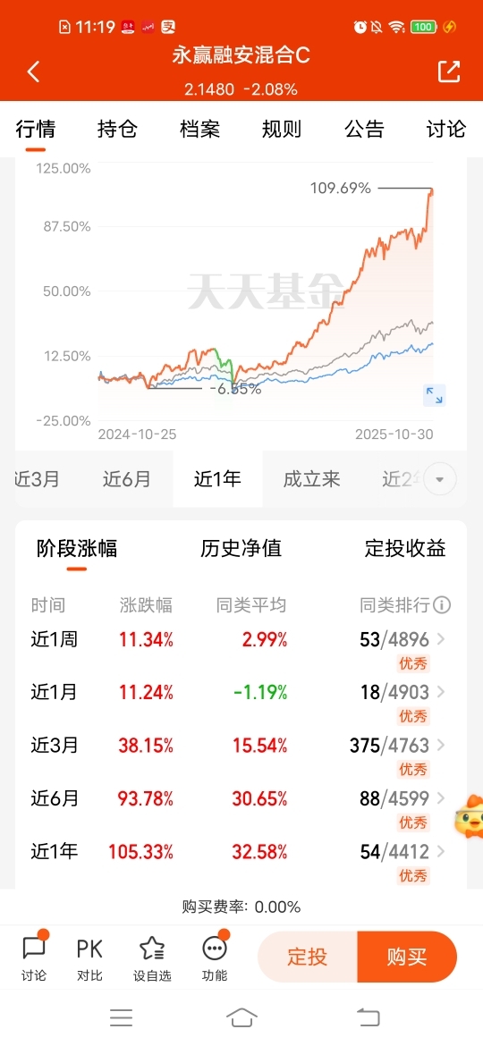 $永赢融安混合C$ 目前也是布局时机,弹性十足的,近一周涨幅11.34%,近三个月涨幅38.15%,近半年涨幅93.78%,近一年涨幅105.33%,各个阶段业绩超额,均衡配置都持有各行业龙头股,积极捕捉每个阶段市场上最具活力的方向,努力做到“跟得上、抓得准”。这样的策略在当前结构性行情突出的环境下尤为重要,中长期布局更有动力。#日定投VS周定投,你更Pick哪一个?#