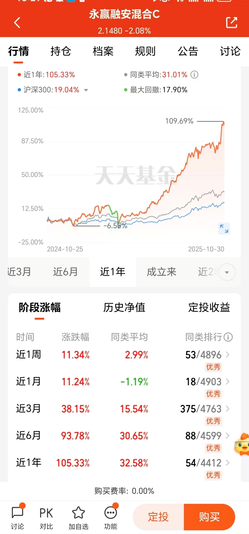 数据显示,基金近3个月上涨38.15%,近6个月上涨93.78%,基金经理确实厉害!现在大盘4000点了,这位置有些板块估值很高,选基难度明显加大。我个人觉得是时候选一些主动基金了。有些优秀的基金经理这轮牛市操作胜率很高,比如永赢融安混合C(020758)的高楠,已经翻倍了,每季度持仓我看了看,都是当季最好的那些股票。