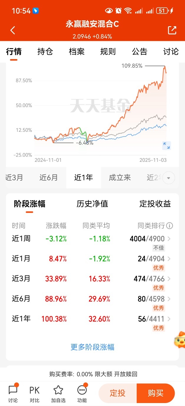 大盘这个位置,配置一点主动基金还是有必要的。$永赢融安混合C$ 凭借基金经理高楠的出色管理和灵活的轮动策略,取得了近1年翻倍的优异成绩,我们一起来看看,近一个月涨幅+8.47%,近六个月涨幅+88.96%,近一年涨幅+100.38%,排名靠前,弹性十足,看好的小伙伴可以关注起来了。#11月基金投资策略#