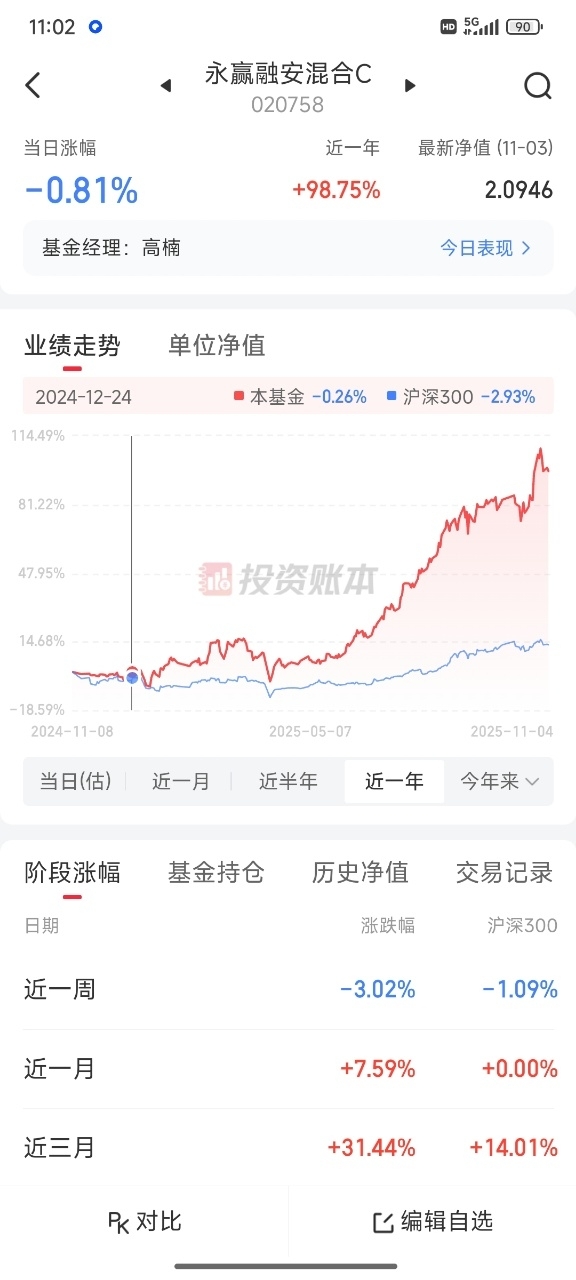 自选里有永赢融安C020758,这基金买的是量子和CPO,近一年收益率100.3