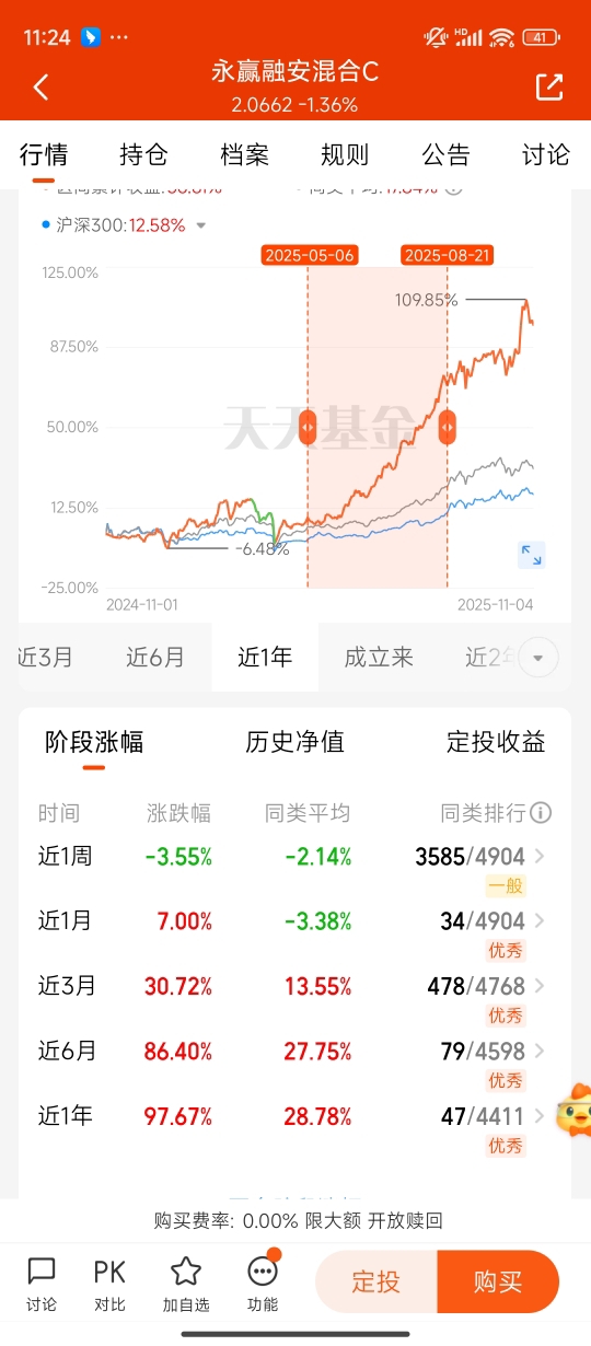 #亚马逊签下OpenAI千亿算力大单# 市场多变不稳。主要还是在科技各个板块之间流转。这只在AI算力、半导体、光通讯、存储芯片等领域切换自如的基金$永赢融安混合C$ ,由基金经理高楠管理,以左侧布局加动态止盈为核心,聚焦科技龙头兼顾消费制造等赛道分散风险。近半年涨幅86.40%。近一年业绩达到97.67%。在震荡市中能灵活捕捉结构性机会,实力强劲啊!
