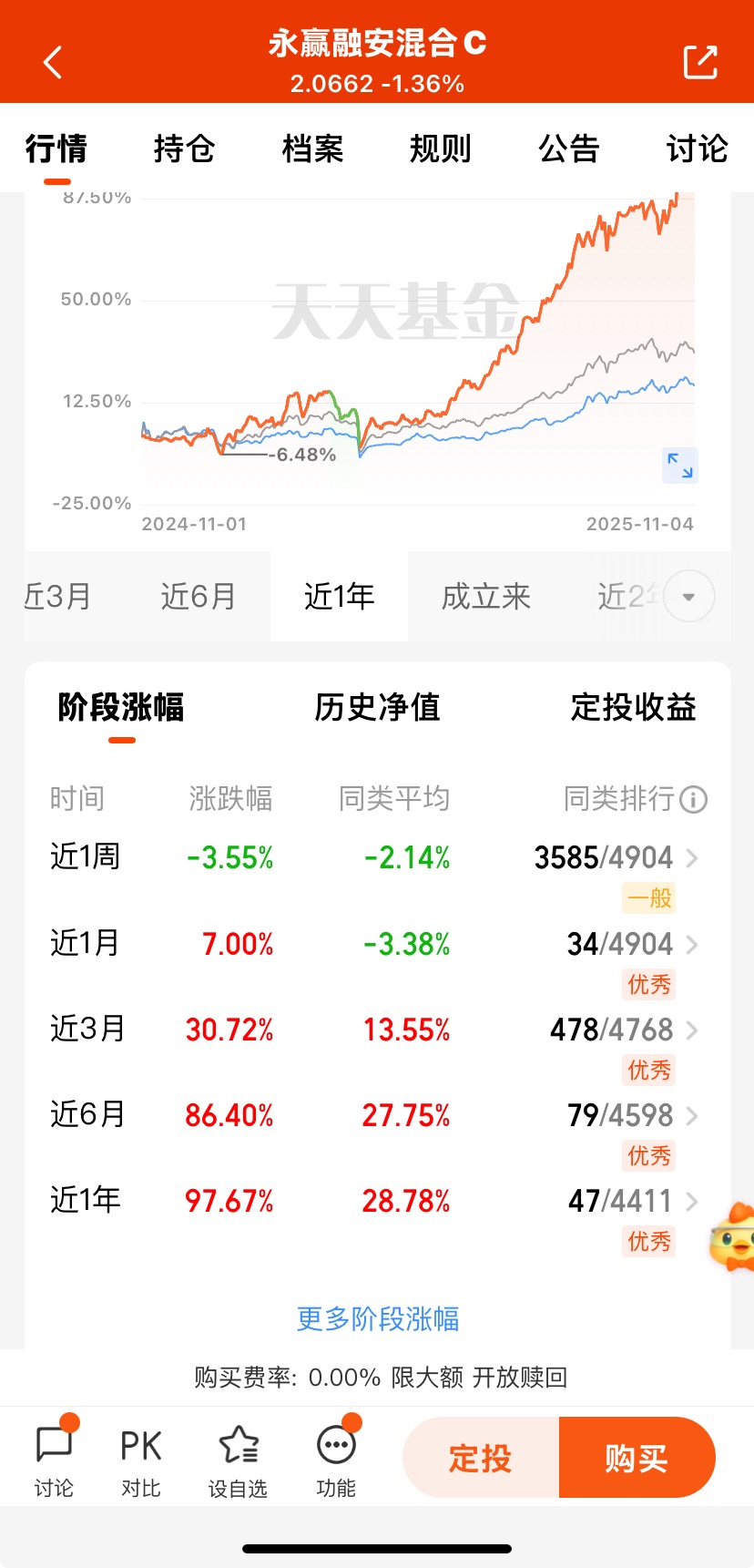 #亚马逊签下OpenAI千亿算力大单# $永赢融安混合C$ 近三个月收益30.72%,近六个月收益86.40%;近一年收益97.67%;业绩在同类基金中表现突出。该基金主要投资于通信设备、医药生物、电子等高成长性行业,这些行业在科技发展和消费升级的背景下具有较大的发展潜力,为基金长期收益提供了支撑。基金通过分散投资、行业配置优化等方式,有效降低了组合风险。