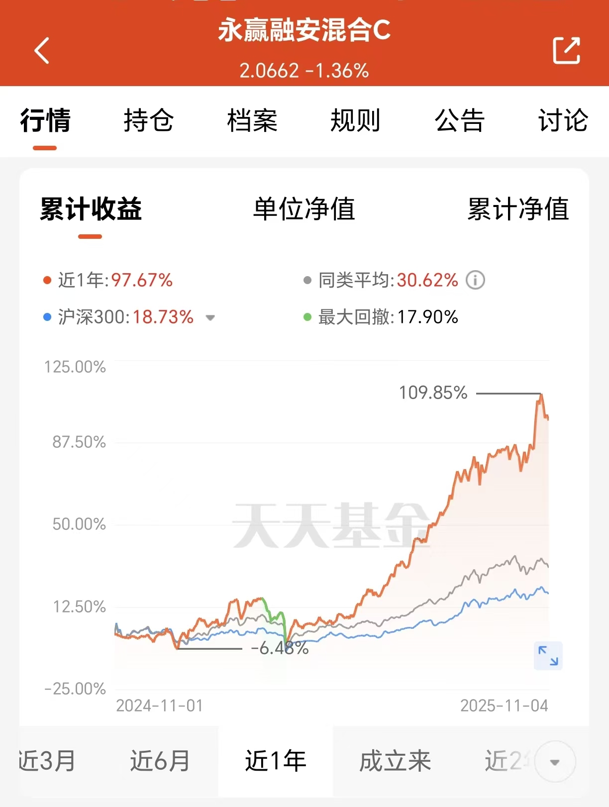 随着近期市场的上涨,有些板块估值已经很高了,这时候选股就比较难了。我个人觉得是时候选一些主动基金了,$永赢融安混合C$ (020758)近1年上涨98.46%,轻松帮忙捕捉科技股轮动中的核心收益,据平台显示持有超过30天以上都是正收益的!