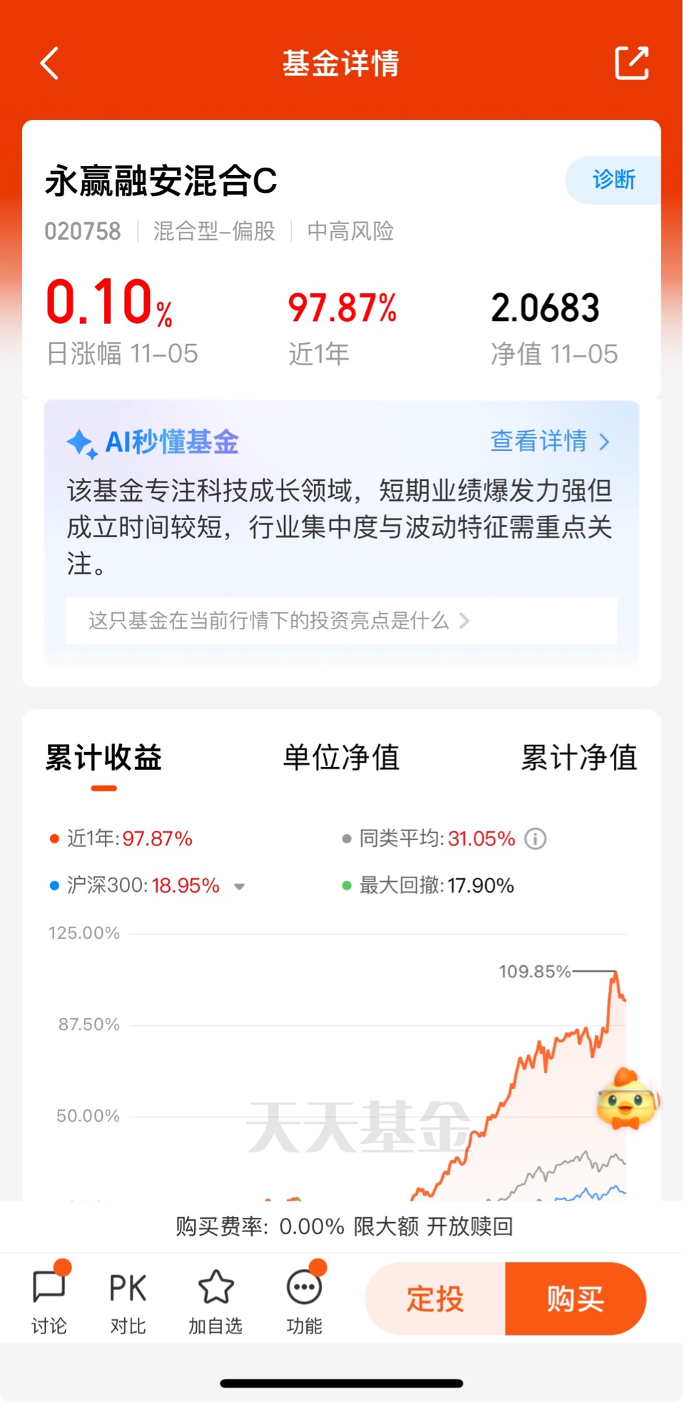 $永赢融安混合C$ 昨天收0.10%,近一个月收7.11%,近3个月收28.91%,近6个月收86.59%,近一年收97.87%,表现优秀!2025年科技股呈现多主线轮动特征,从人工智能及算力产业链,到半导体、光通信、存储芯片,热点不断切换。而这只基金总能紧跟趋势,抓住每个阶段的核心热点。