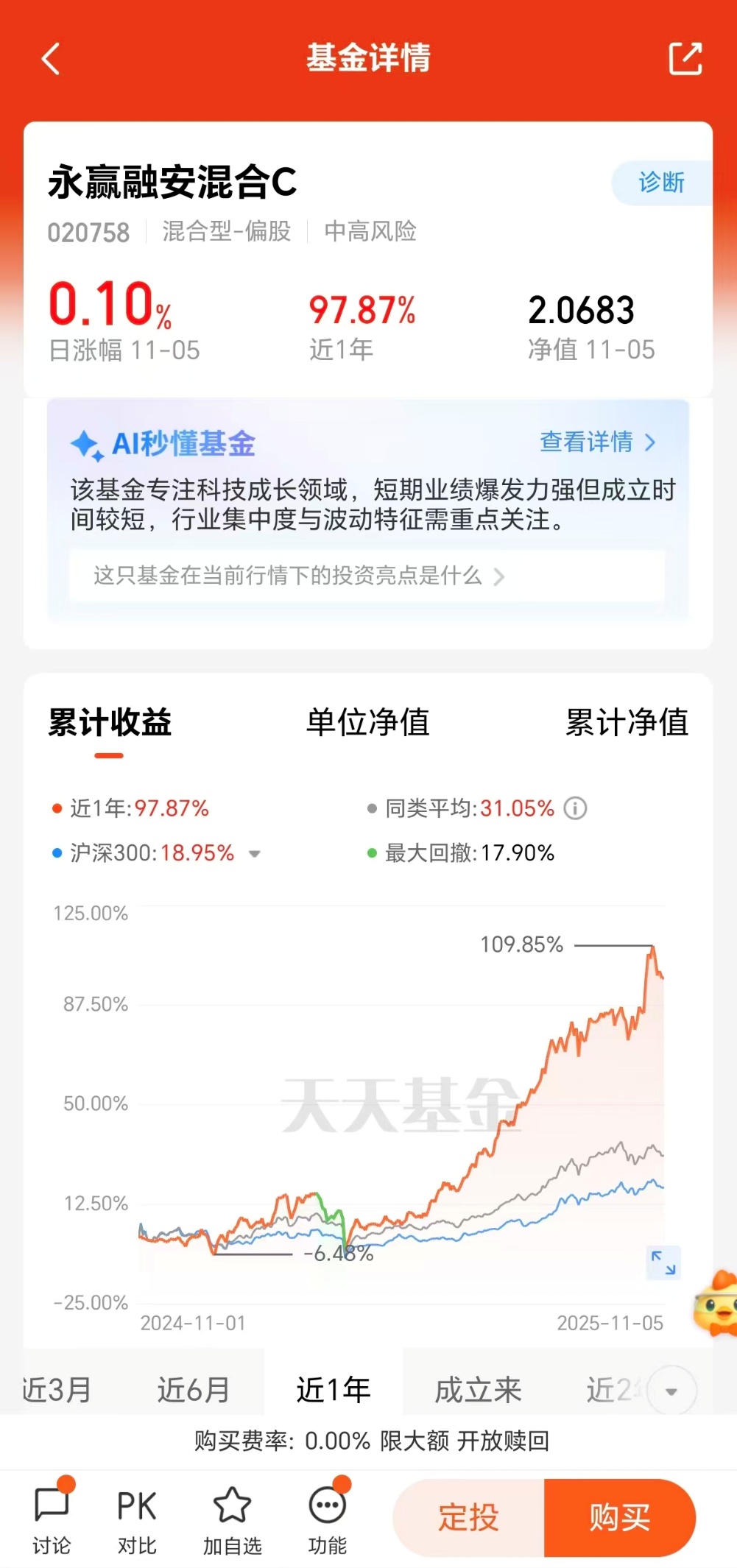 结构性行情下,能精准把握市场节奏的优质基金愈发抢手,而$永赢融安混合C$ (020758)正是这样一只让人眼前一亮的潜力好基——成立以来累计上涨106.83%,近1年更是强势上涨97.87%,亮眼业绩在同类基金中脱颖而出,成为投资者布局市场的热门选择。