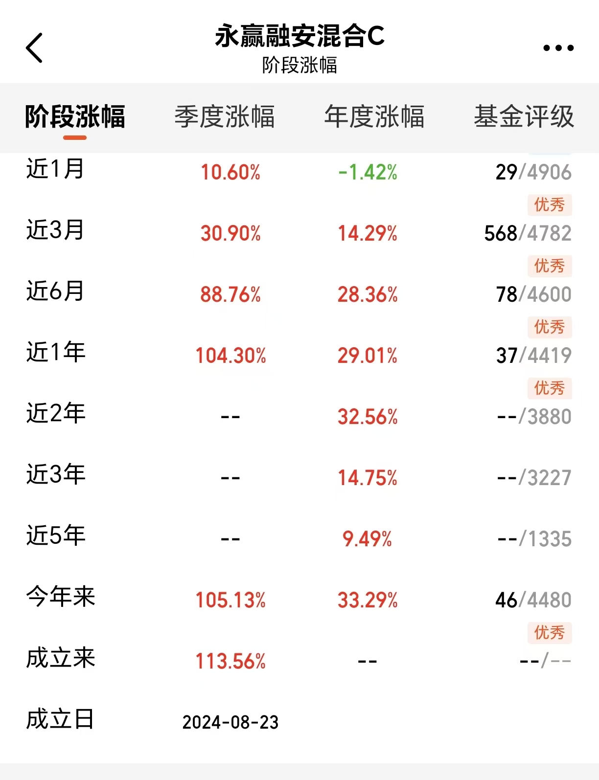 当市场还在苦思冥想“下一个热点究竟花落谁家”时,$永赢融安混合C$ (020758)早已凭借出色的业绩给出了响亮答案——昨日涨幅达3.25%,近1月收益为10.60%,近3月收益高达30.90%,近6月收益更是达到88.76%,近1年收益突破104.30%,今年以来收益已达105.13%,自成立至今收益累计达113.56%,在市场震荡中脱颖而出,成为难得一见的“翻倍基”。这只基金能够取得如此佳绩,得益于基金经理高楠对科技行业轮动机会的精准把握,以及其“攻守兼备”的卓越投资策略。