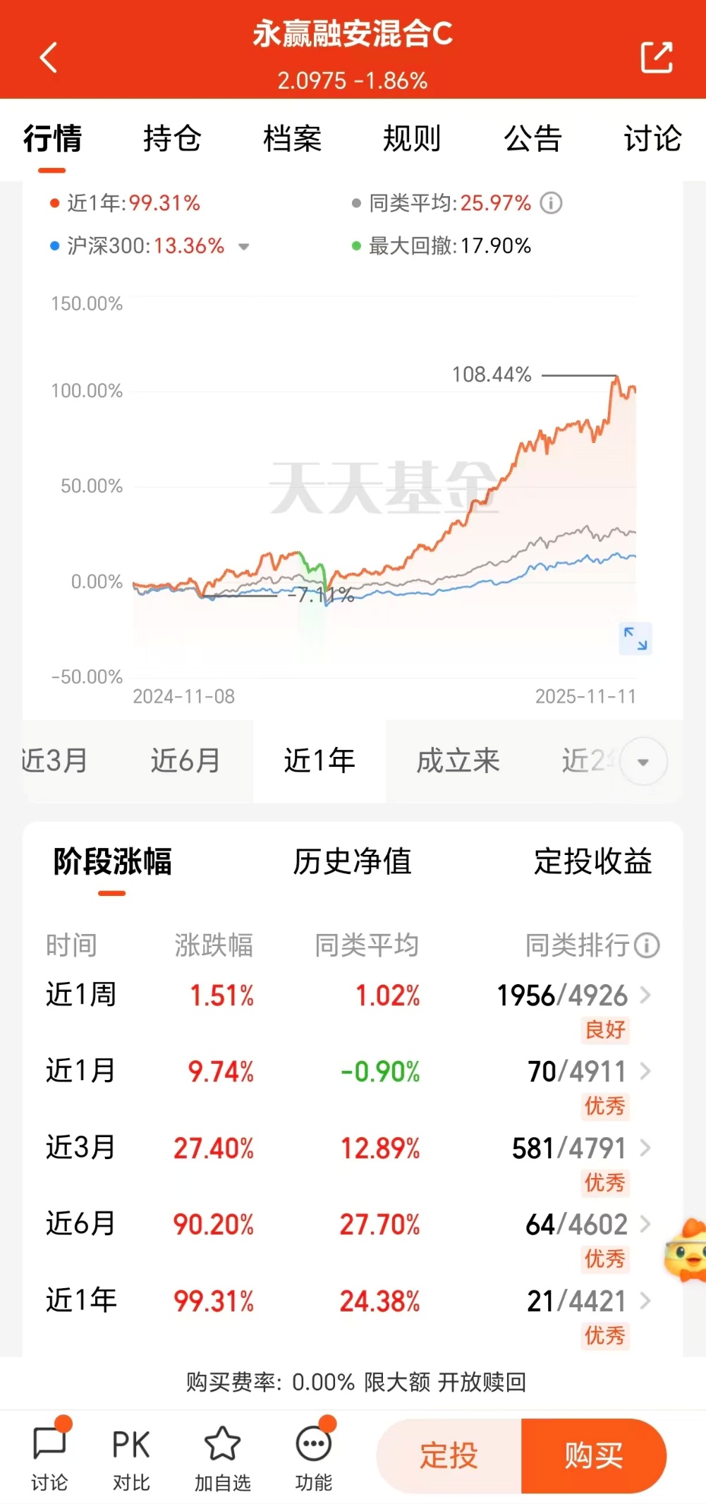 近期市场持续震荡,四季度更应该选择那些实力过硬的优质基金,而$永赢融安混合C$ (020758)。这只基金不仅短期表现亮眼,近三月上涨27.40%;中长期业绩更是令人瞩目,近6月上涨90.20%,自成立以来已取得109.75%的累计收益,成为永赢基金旗下又一只实现翻倍收益的明星产品。