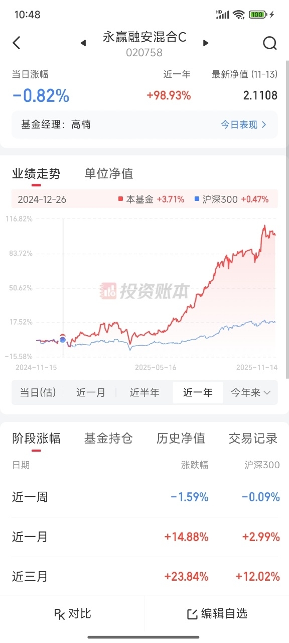 这一波上涨行情不要乱动要拿稳吃肉了,在各种利好的带动下行情还会一直持续上涨的,在社区找到一只翻倍基,永赢融安C020758,这基金买的是量子和CPO,近一年收益率100.57%,基金经理高楠,被誉为选股大神,跟他买比我自己操作赚得多。