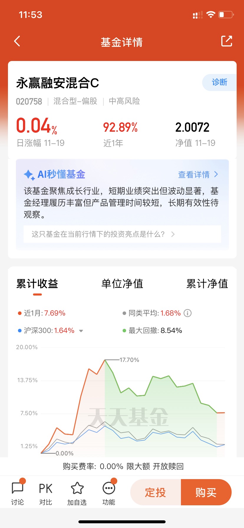 $永赢融安混合C$ 昨天涨了0.04%,近半年涨超80%,短期业绩弹性很强,业绩表现优秀亮眼的很了!永赢融安聚焦成长行业,本季度买的量子和CPO,都是空间广阔弹性强的板块,不得不说基金经理高楠的选股能力和逆向思维确实很强,值得关注起来了!#观点搭子团火热招募中!#