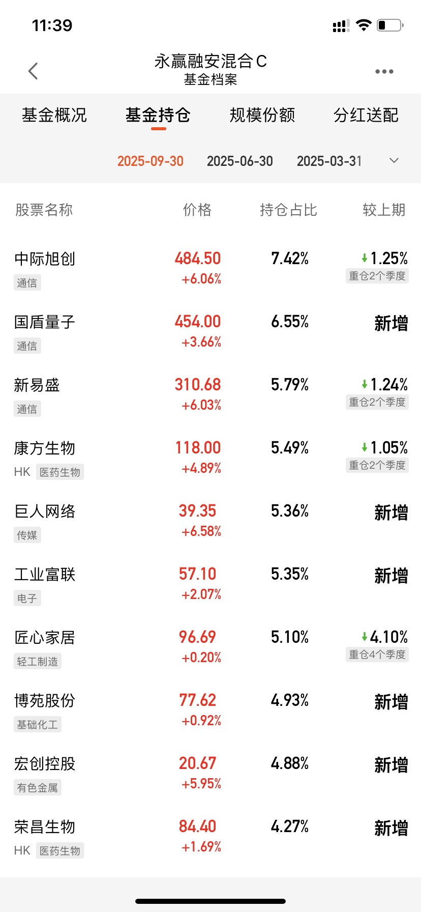 $永赢融安混合C$ 专注科技成长赛道,本季度买了量子和CPO,今天CPO大哥强势回归,还有些期待呢!永赢融安近半年涨超65%,同类平均涨超21%,业绩表现远超同类平均表现,可见业绩弹性很强,短期爆发力十足啊!目前持仓股飘红,走势向上啊,期待今天的表现了!#低估补涨号启航#