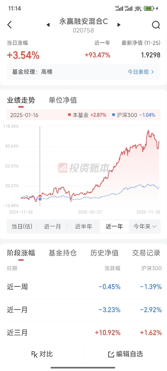 这一波上涨行情不要乱动要拿稳吃肉了,在各种利好的带动下行情还会一直持续上涨的,永赢融安C020758这基金买的是量子和CPO,近一年收益率86.40%,基金经理高楠,被誉为选股大神,跟他买比我自己操作赚得多。