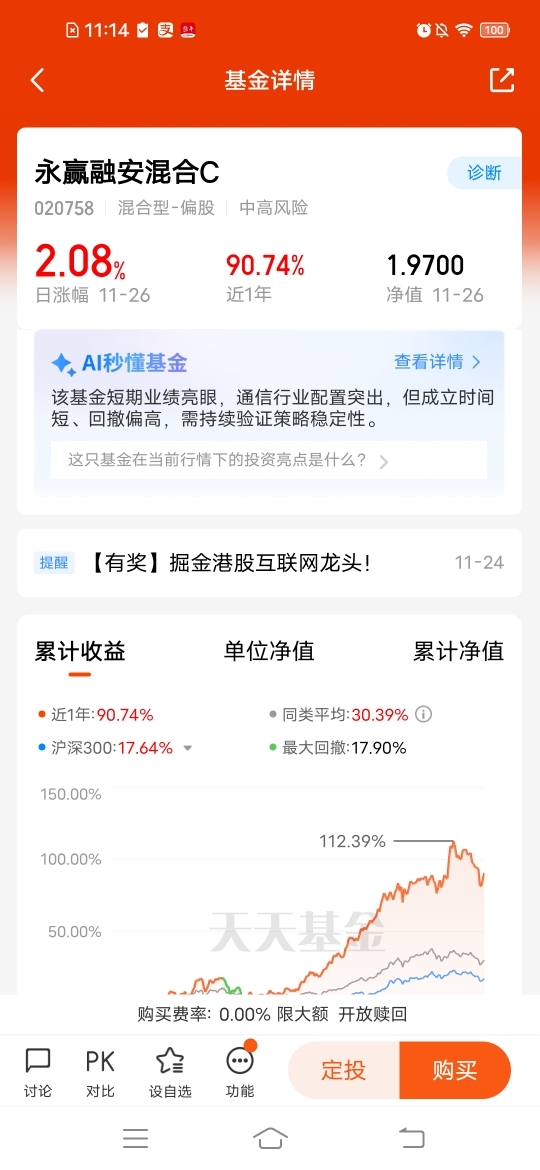 $永赢融安混合C$ 趋势向好,昨天涨幅2.08%,近三个月涨幅9.35%,近三个月涨幅75.25%,近一年涨幅90.74%,弹性足,始终围绕市场主线灵活布局,既有量子计算、CPO等符合科技发展趋势的板块,也配置了一些虽然相对小众但基本面扎实、走势稳健的个股,整体组合兼顾景气度与估值安全,力争在不同市场风格中争取超额收益。#观点搭子团火热招募中!#