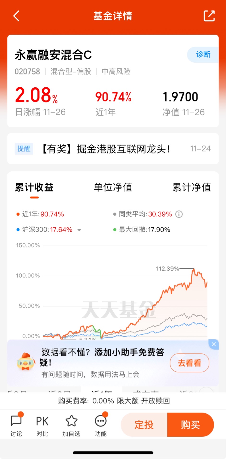 $永赢融安混合C$昨天收2.08%,近3个月收9.35%,近6个月收75.25%
