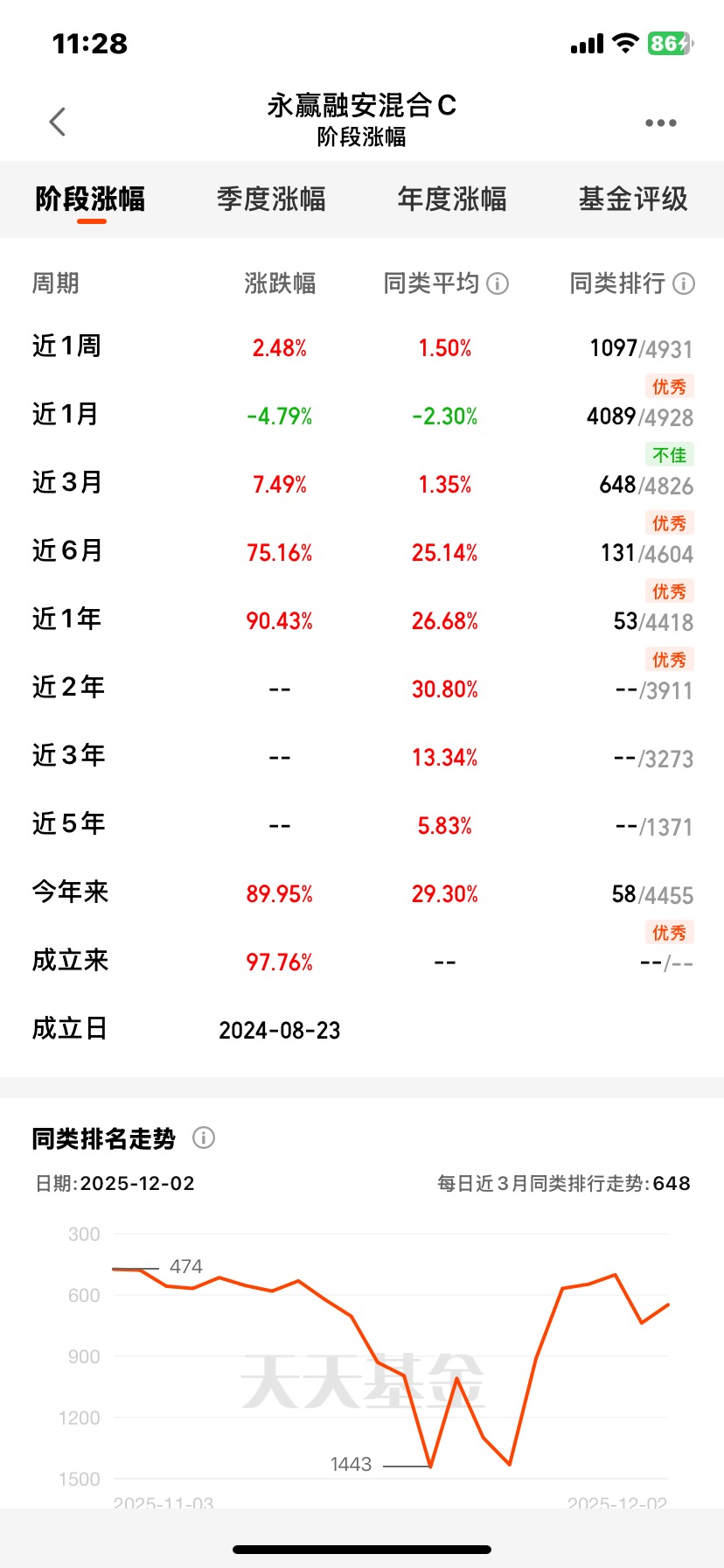 #机构:看好“春季行情”提前开启# $永赢融安混合C$ 近三个月收益7.49%,近六个月收益75.16%;近一年收益90.43%;业绩在同类基金中表现突出。永赢融安C作为一支全市场选股的基金更加灵活,适合现在让大家比较纠结的市场,灵活性强,动态调整持仓,基金重仓的通信、医药、化工等行业处于快速发展期,高楠的选股能力强,今年前三季度每次季报公布看持仓,总能踩中热点行情,CPO、量子计算、创新药等有色周期都能踩中!这种主动选股的就很适合现在持有。