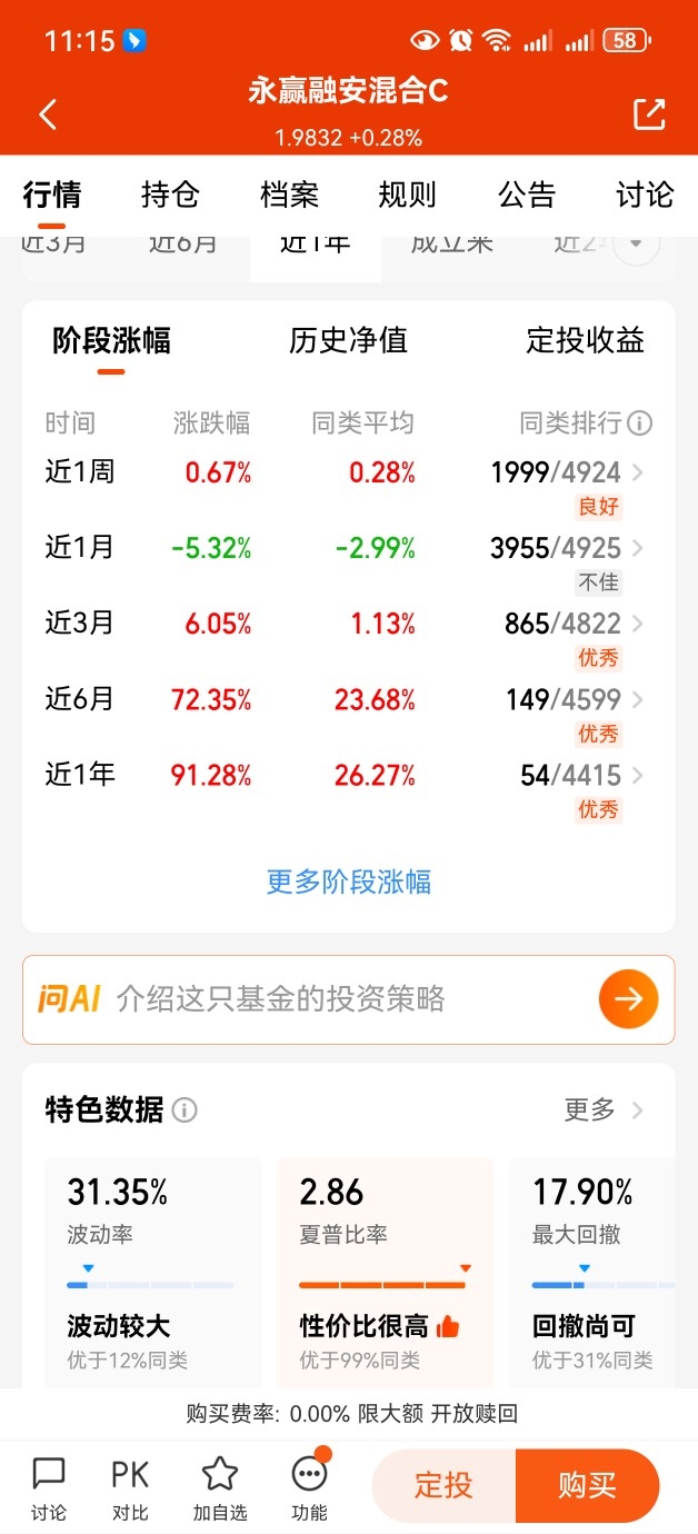 还挺惊喜的,永赢融安混合C昨天居然逆势上涨了,近四天有三天上涨。产品聚焦科技核心赛道,属于灵活配置型产品,不拘泥于单一行业或主题,而是积极捕捉每个阶段市场上最具活力的方向,近六个月涨幅+72.35%,近一年涨幅+91.28%,弹性还挺强的呢,看好的小伙伴可以关注起来了。#12月基金投资策略#