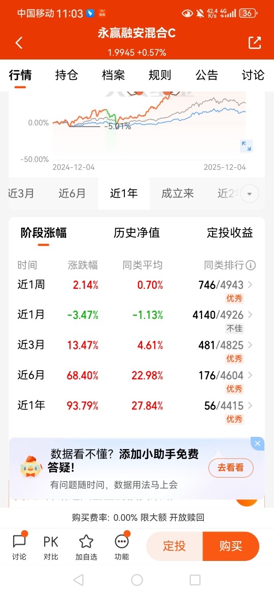$永赢融安混合C$ 各个阶段表现优秀!一起来看看他的业绩表现吧,近三个月涨幅+13.47%,近六个月涨幅+68.40%;它是一个主动基金,优秀的基金经理这轮牛市操作胜率很高,已经翻倍了,每季度持仓我看了看,都是当季最好的那些股票。几个热门赛道,基金经理还轮动操作,未来可期呀#12月基金投资策略#