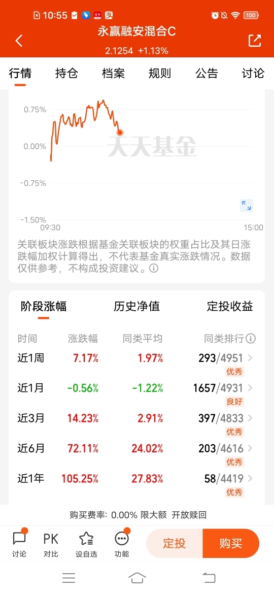 $永赢融安混合C$ 昨天涨幅1.13%,近一周涨幅7.17%,近三个月涨幅14.23%,近半年涨幅72.11%,近一年涨幅105.25%,各个阶段业绩稳定,均衡配置都持有各行业龙头股,积极捕捉每个阶段市场上最具活力的方向,属于是电风扇行情,这种情况单押某个赛道不稳,中长期持有更有优势。#低资金门槛布局北交所#