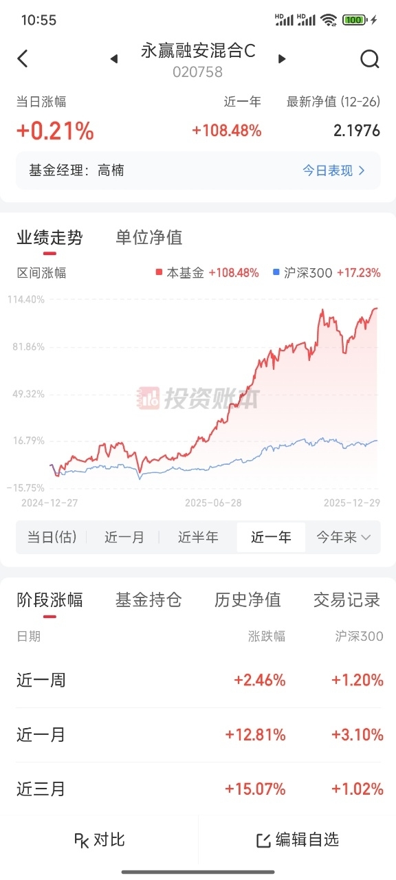 新的一周加油呀,非常看好永赢融安C020758,这基金买的是量子和CPO,今天估值又上涨0.21%,近一年收益率103.63%,基金经理高楠,被誉为选股大神,量子和CPO作为主流赛道,中长期发展空间依然广阔。