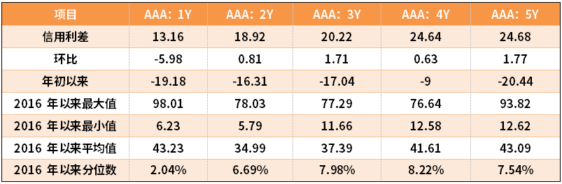长期限高等级票据信用利差短期收窄,长期走阔。中债1年期AAA级中短期票据信用利差收窄5.98BP,中债2年期AAA级中短期票据信用利差走阔0.81BP;中债3年期AAA级中短期票据信用利差走阔1.71BP。