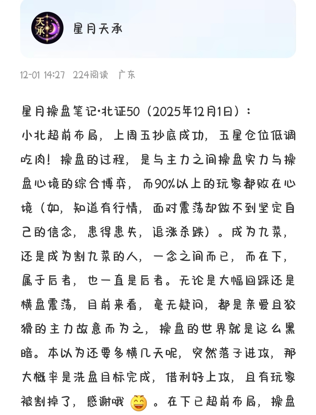 星月操盘术,11.21,11.28日侥幸成功预判并捕获北证50第二波底部区间,超前布局成功!六星仓位低调吃肉(约8成)!!韭菜不灭,主力不拉,操盘世界中永恒不变的真理,操盘的世界就是这么黑暗。感谢亲爱的主力辛苦洗盘,同时也感谢前几天割肉的九菜玩家哦