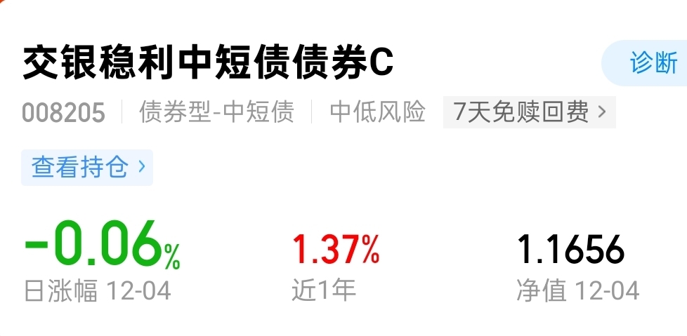 最近债市晃得慌,$交银稳利中短债债券C$ 不投股票波动小,稳稳的,7天免赎回,一年1.37%比放活期划算多了
