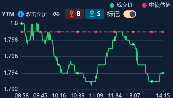 二、十年期国债收益率:1.7904 -0.005%(国债收益率越涨,债市越跌,两者反向关系)