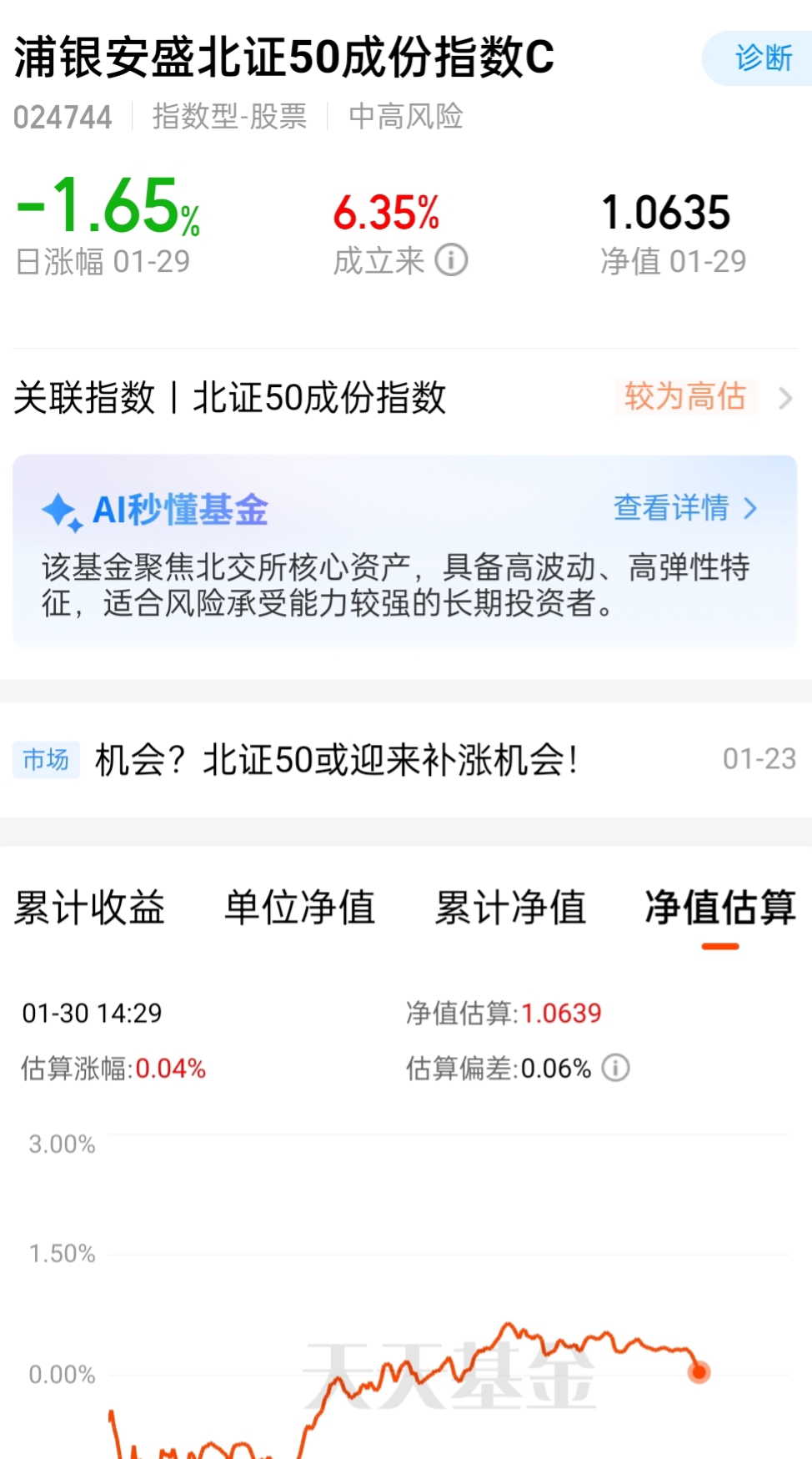 北证50今天企稳了,可以继续关注,$浦银安盛北证50成份指数C$不限额,主投专精