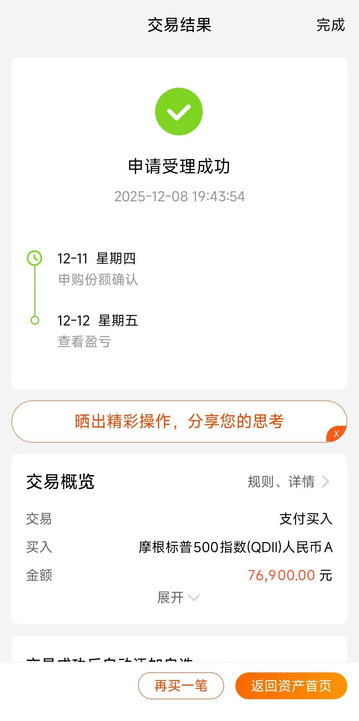 今天必须说!$摩根标普500指数(QDII)人民币C$(019305)和$摩根纳斯达克100指数(QDII)人民币C$(019173)额度开了,单日10万!这可能是今年最后一次大额申购机会了!你们知道现在市场有多疯狂吗?比如国泰标普500ETF联接A(017028)这种干脆暂停申购,想多买点都买不了。易方达标普500A(161125)、就只能买10块,天弘标普500A(007721)就只能买50。纳斯达克方面,博时纳斯达克100ETF联接A(016055)、建信纳斯达克100人民币A(539001)根本就不让买,嘉实纳斯达克100ETF联接A(016532)、招商纳斯达克100ETF联接A(019547)、华泰柏瑞纳斯达克100ETF联接A(019524)只能买100,剩下的都只能买个50和10块的。我直接买了点,这俩基金今年表现都不错,标普500涨了17%,纳指100涨了22%,长期看好美股科技股。额度说没就没,要买抓紧!#低估补涨号启航#