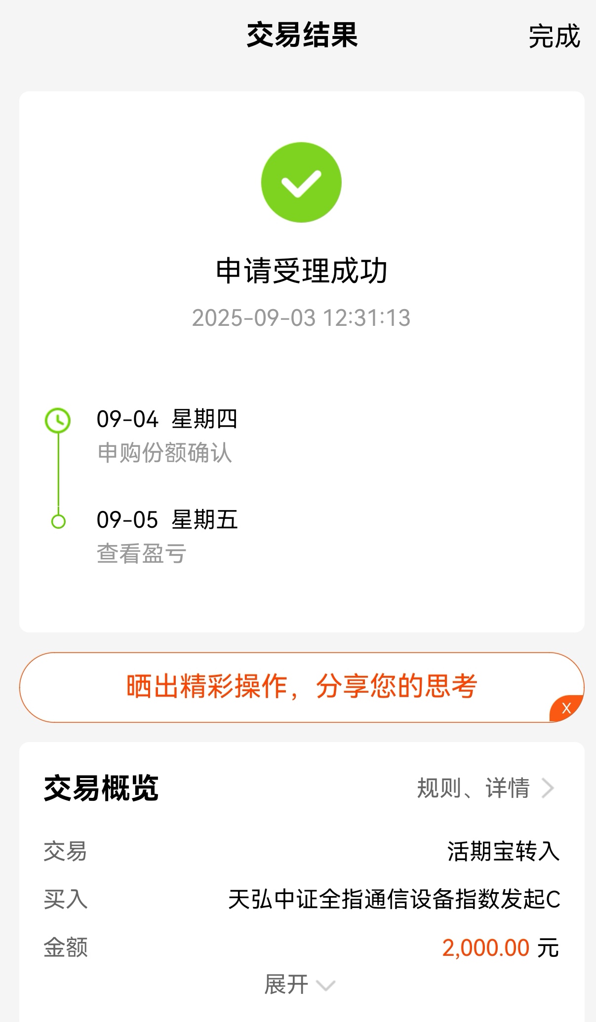 $天弘中证全指通信设备指数发起C(OTCFUND|020900)$通信成长空间大,前景也很不错,近一周反弹10.60%,同类平均才涨0.65%,近一个月涨42.76%,同类平均才涨11.82%,足足高出了10倍的收益,业绩确实优秀,现在AI算力需求也很大通信设备需求价值凸显,今天趁回调继续加仓干。