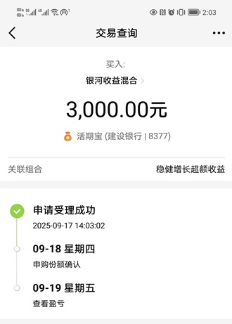 2.偏债基金:我今天继续加仓$银河收益混合(OTCFUND|151002)$3000元。这是一支偏债基金,也可以称为“固收+”基金,目前配置了12.08%的股票,主要布局了CPO为代表的科技高成长赛道和银行为首的红利低波两个方向,攻守两端两手抓。债券类占比约90%,主要布局了信用债,提供票息安全垫,组合修正久期约3年,低于长债基金平均水平,利率风险敞口可控。本基金近1年涨12.64%,近3月涨8.81%,近1月涨5.72%,近1周涨1.08%,作为一支“固收+”产品,这收益能力表现十分出色。昨天港股创新药一支个股盘中突破跳水,由涨超50%到跌超50%,也就用了不到两小时,这也给我提了一个醒,不管行情多好,都要做好风险控制。我觉得适当布局偏债基金,进可攻,不至于完全踏空,退亦可守,不必天天提心吊胆,确实是不错的选择,因此我今天决定继续加仓本基金,把它作为账户安全垫,中长期配置。下面我晒一下买入操作记录: