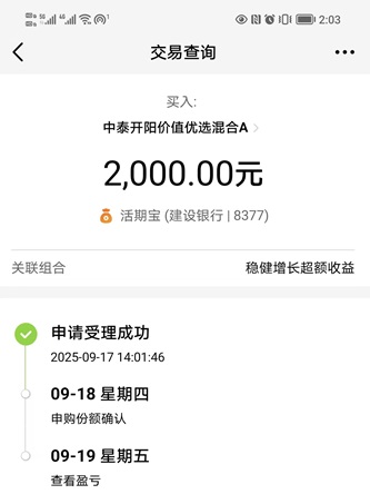 3.价值优选:我今天继续加仓$中泰开阳价值优选混合A(OTCFUND|007549)$2000元。这支基金是一支灵活配置型混合基金。通过自上而下深入研究行业板块,自下而上深挖低估优质个股,坚持质价双优布局。下半年以来,管理层深底推进行业反内卷措施,本基金受益于供给侧改革,均衡布局芯片半导体,白酒、建筑材料、基础化工等行业。近1年涨54.24%,近6月涨13.24%,近3月涨22.56%,近1月涨11.93%,近1周涨3.85%,各时间周期表现都不错。昨天下午证券逐渐转强,今天继续表现强势,带动人气回暖,助力今天A股三大指数尾盘逐渐走强,科技成长赛道反弹信号明显,我认为新一轮上涨即将到来,今天是二次进场布局的好时机,我果断继续加仓本基金。下面我晒一下买入操作记录: