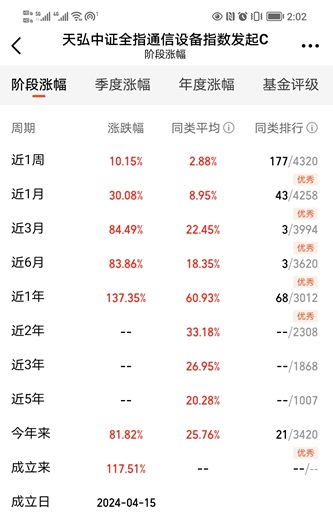 1.通信设备:我今天继续加仓$天弘中证全指通信设备指数发起C(OTCFUND|020900)$1000元。这支基金是中证全指通信设备指数(931160)的ETF联接基金。该指数从中证全指指数中选取业务涉及通信设备领域的股票作为指数成份股。本基金紧密跟踪指数,近1年涨153.93%,近3月涨92.08%,近1月涨33.16%,近1周涨10.50%,表现非常优秀。通信设备近期经历了一波调整,目前有明显企稳回升的信号。