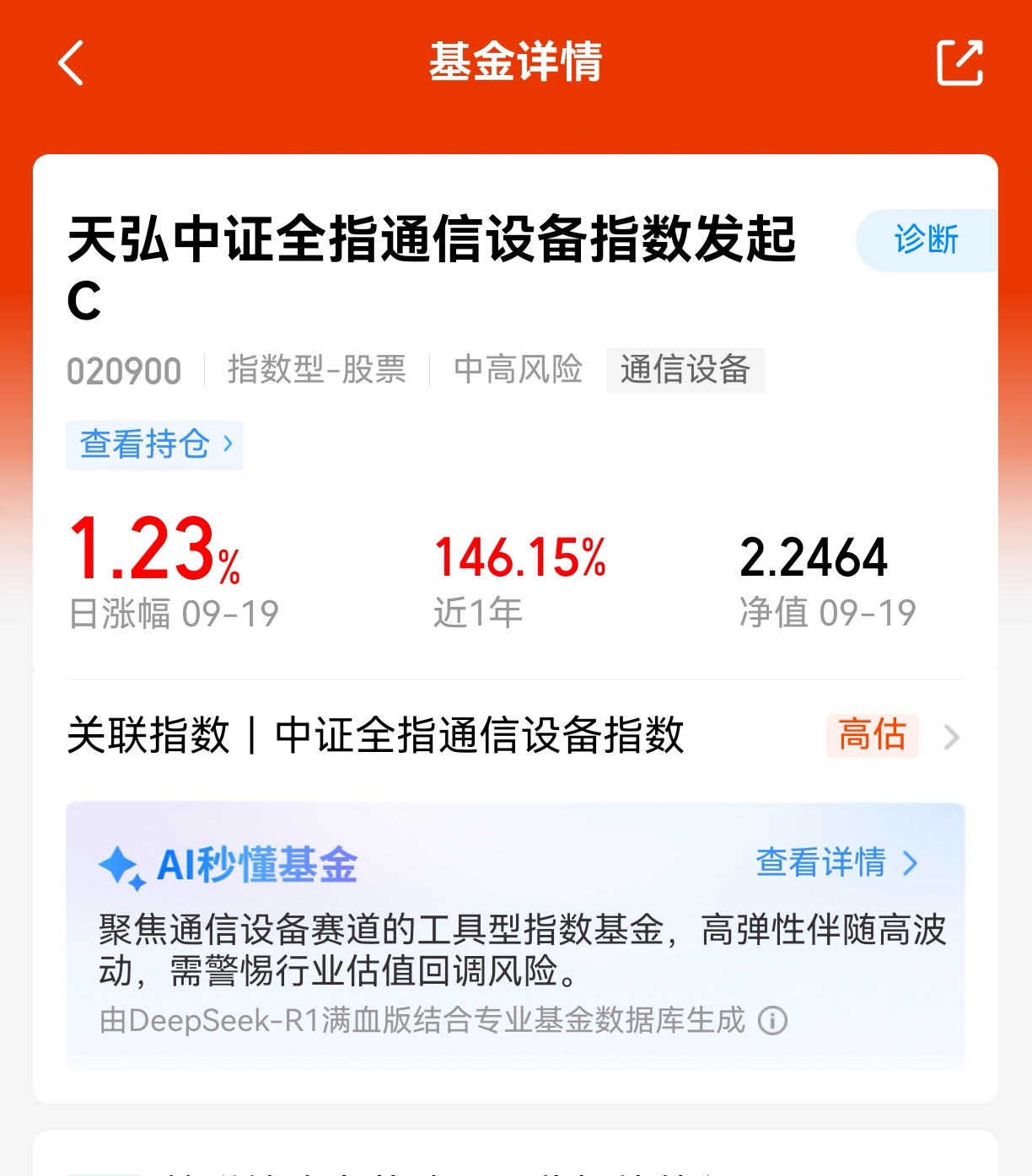 $天弘中证全指通信设备指数发起C(OTCFUND|020900)$通信不得不说优秀啊,今天又涨了,上周五涨了1.23%,加今天算是连续反弹5天了,果然修复快,近一年上涨超146.15%,相当优秀了,而且工信部印发《关于优化业务准入促进卫星通信产业发展的指导意见》,提出支持低轨卫星互联网加快发展,针对低轨卫星通信应用适时开展商用试验,推动手机等终端设备直连卫星加快推广应用。9月8日,工信部向中国联通颁发卫星移动通信业务经营许可,中国联通可依法开展手机直连卫星等业务,通信利好多,前景也很好,费率还有优势,买入0申购费,满7天卖出0赎回费,不错的,可以分批止盈点,回调再低吸也成。