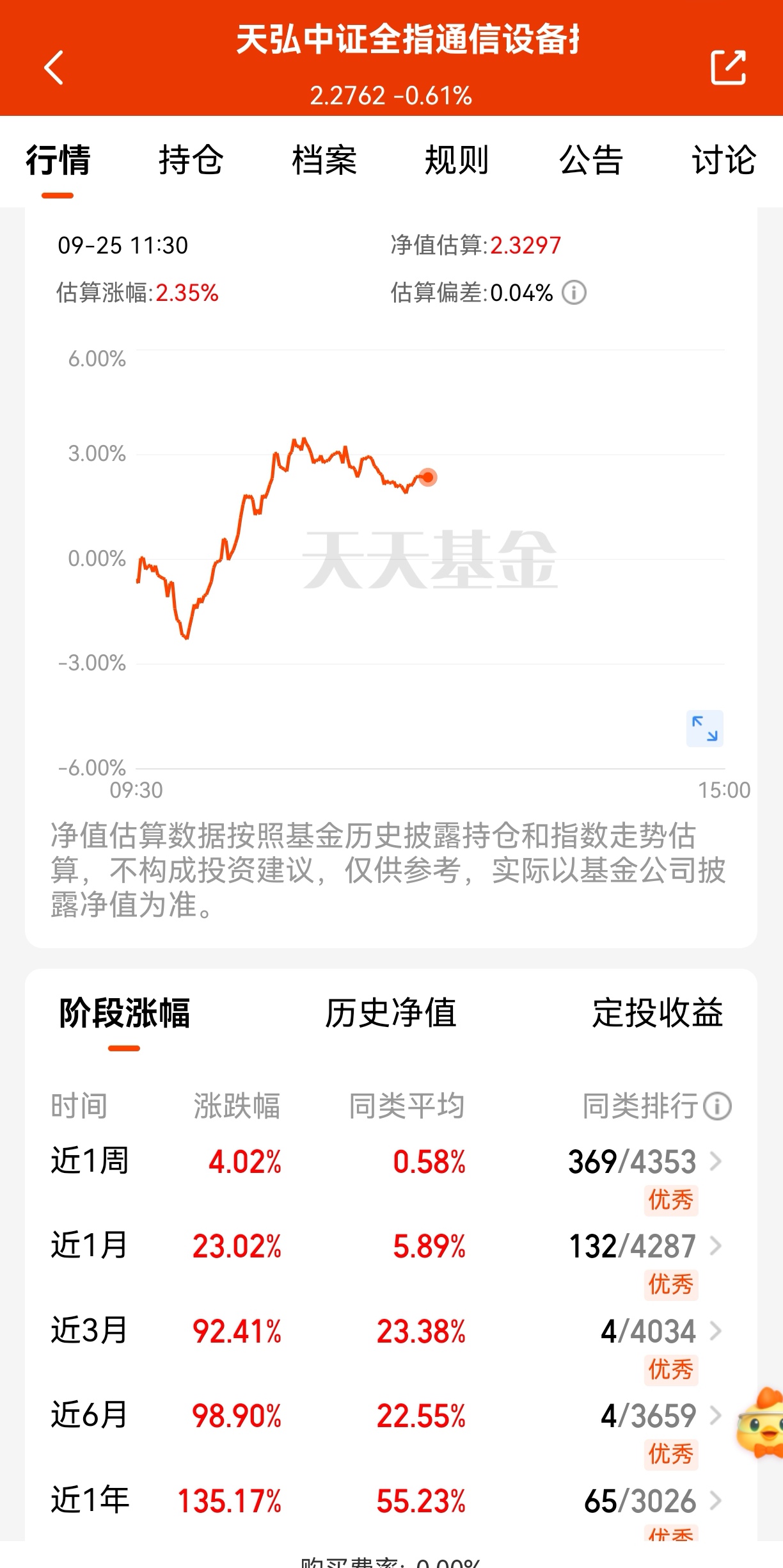$天弘中证全指通信设备指数发起C(OTCFUND|020900)$通信今天又涨了2个多点,牛啊,有涨有跌很健康,而且涨多跌少,业绩还是可圈可点的,近一个月上涨23.02%,同类平均才涨5.89%,近一年上涨135.17%,同类平均才涨55.23%,不错的,昨天回调也是机会,继续拿住画重点,后续围绕十五五规划的消息会越来越多,通信大概率还会涨的。