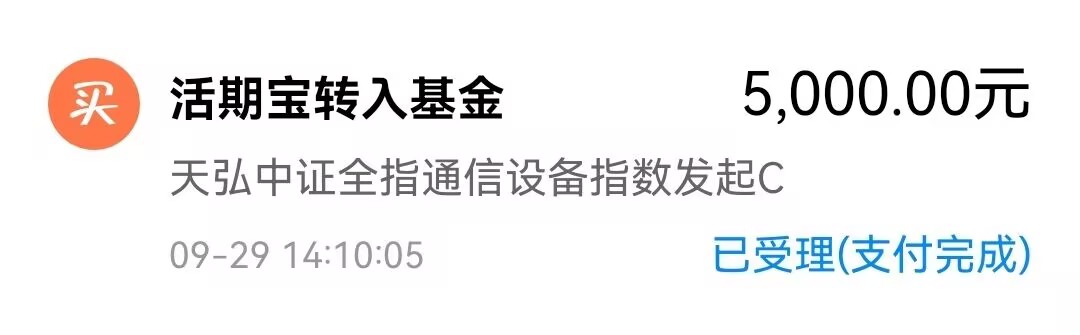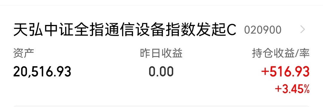 $天弘中证全指通信设备指数发起C(OTCFUND|020900)$ 可以一键把握通讯设备优质龙头股,近六个月上涨超101%,近一年上涨超125%,业绩均在同类竞争力排名前2%,我今天加仓5000元。
