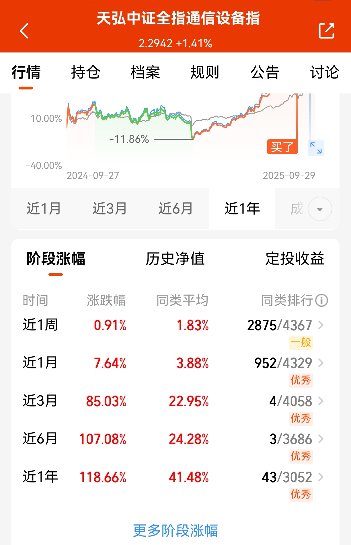 $天弘中证全指通信设备指数发起C(OTCFUND|020900)$通信继续加仓,业绩非常强的,涨多跌少,近一年涨幅超118.66%,而且利好也多,看来有必要多加点仓,现在在加快构建智能网络和算力基础设施,推动人工智能与实体经济深度融合。随着“AI+通信”场景逐步落地,通信设备需求有望迎来新一轮上升,所以可以做中长线,反正这只基金买入0申购费,满7天卖出0赎回费,费率也有优势。