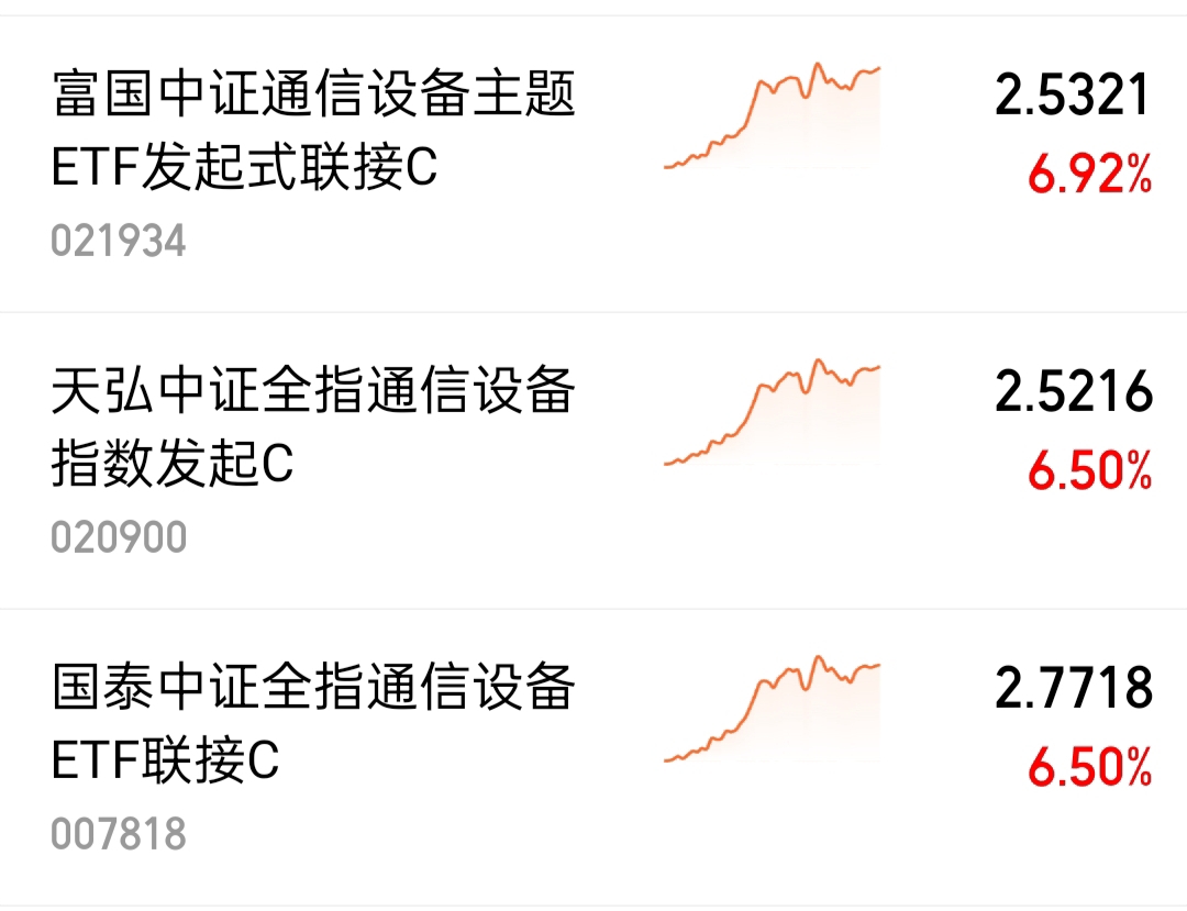 今天的通信板块活跃,涨的很好,大科技总是投资的方向$富国中证通信设备主题ETF发起式联接C$ 涨了6.92,$天弘中证全指通信设备指数发起C$ 涨了6.5,$国泰中证全指通信设备ETF联接C$ 也涨了6.5,通信雄起