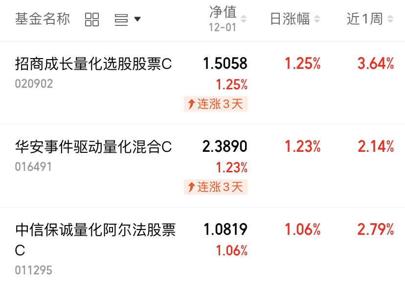 近期三大指数太给力,借着放量的势头,稳稳站上了 60 日线这条重要的中期均线。这位置站稳可是好事,代表中期趋势有了支撑,$招商成长量化选股股票C(OTCFUND|020902)$近1周上涨3.64%,$华安事件驱动量化混合C(OTCFUND|016491)$近1周上涨2.14%,$中信保诚量化阿尔法股票C(OTCFUND|011295)$近1周上涨2.79%。