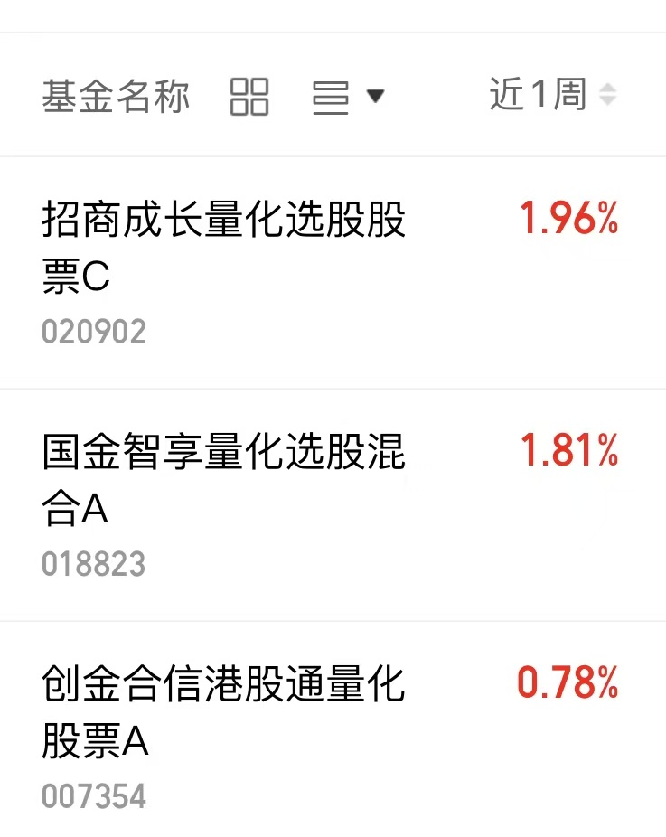 今天大盘继续调整,三大指数集体走低,下跌的个股比较大,近期行情波动大呀,不过量化基最近表现还是蛮不错的,来看看近一周涨幅情况