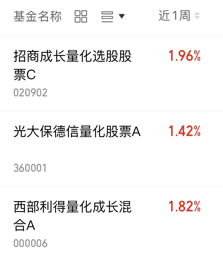今天大盘继续回调,又是吃面的一天,科技、医疗等板块延续调整,行情比较难,量化基近期表现还不错,来看看近一周涨幅情况