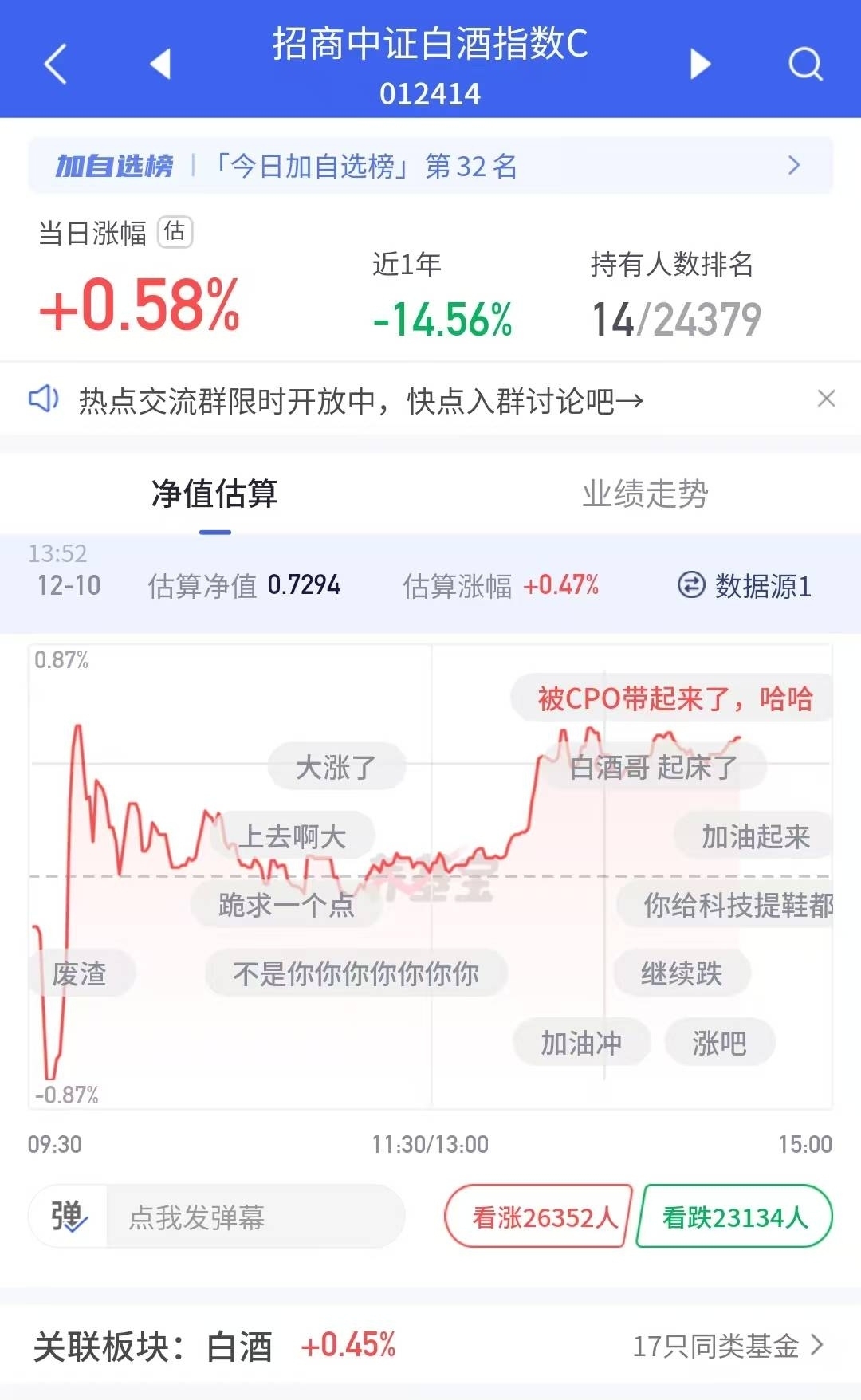 高估值成长板块遭资金减持,低估值消费成新宠,今天白酒指数表现让人满意。招商中证白酒指数 (LOF) C 覆盖优质标的,政策对消费场景约束趋缓,需求逐步释放。$招商中证白酒指数(LOF)C$