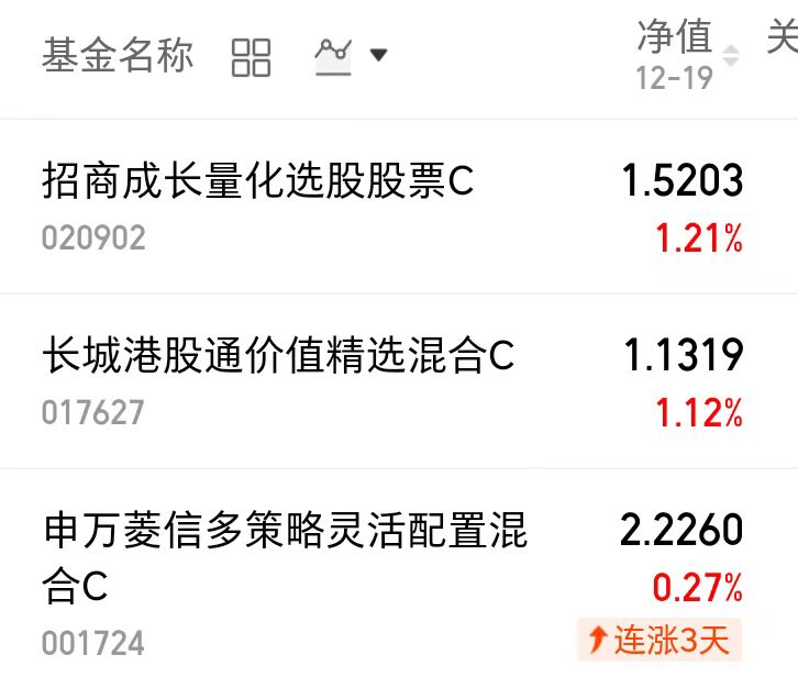 $长城港股通价值精选混合C(OTCFUND|017627)$上周五上涨1.12%$申万菱信多策略灵活配置混合C(OTCFUND|001724)$上周五上涨0.27%