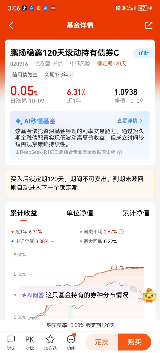 ,收益排名持续占据领先位置。这只基金的债券占比超过80%,且全是高等级品种,像AAA级的商业银行债占了不少,债底稳健。最近的市场行情太适合它了,股债双涨,它的债券和权益部分同时发力,债券受益于资金面宽松,价格上涨带来资本利得,权益仓跟着股市普涨赚收益,这种“双丰收”的体验太爽了。近期结算刚允许信用债ETF开展质押式回购,这会提升信用债流动性,它持有的信用债估值会更有支撑,加上境外资金入市增多,债券资产需求旺盛,收益有保障。其权益仓的择时能力更是远超预期,不到20%的仓位精准踩中热点。持仓里的电子板块近期受政策扶持涨得特别好,金融股则靠低估值抗跌,昨天股市上涨时这部分直接拉高一截收益。基金经理张李陵调仓很灵活,不会死扛冷门赛道,总能提前布局景气板块。这基能同时享受到债市和股市的红利,净值曲线走得又稳,比放余额宝划算多了#大消费板块逆市拉升!行情能否持续?#