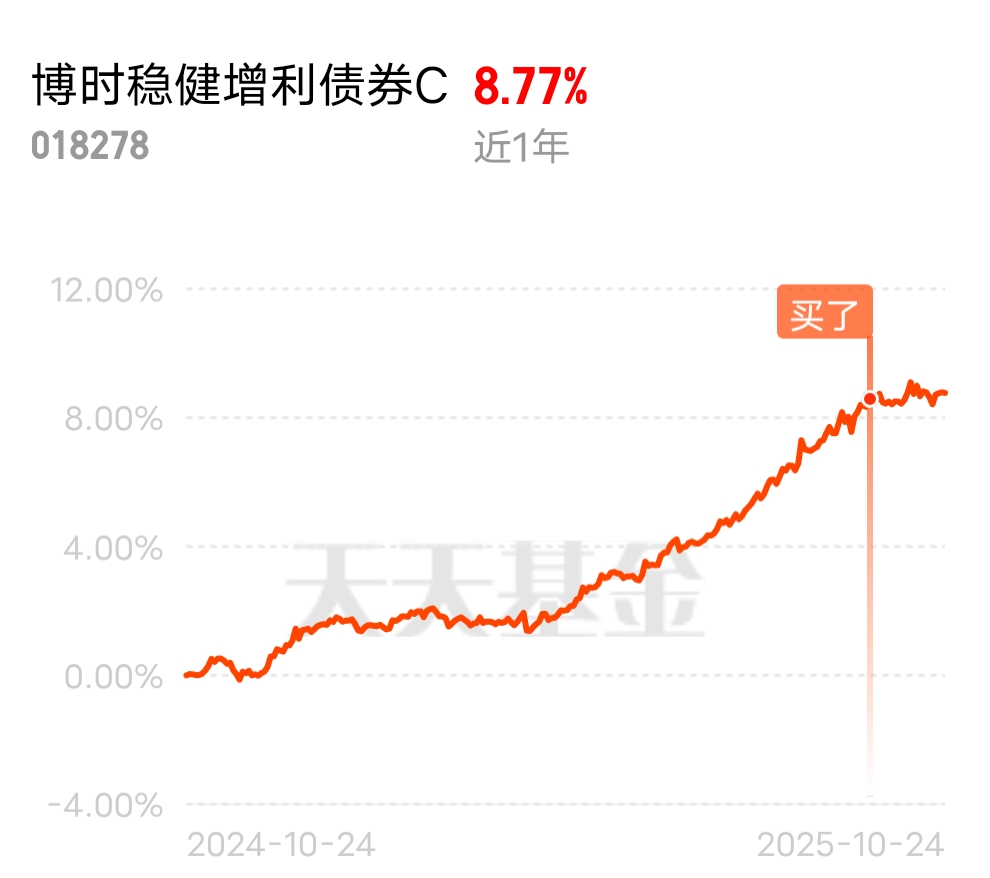 现阶段债市横盘震荡,但$博时稳健增利债券C$ 一直延续它“稳中有进”的风格,近一周稳定产蛋两位数,三个月下来涨幅直逼3%,近一年累计收蛋877个,持续收益能力十分出色。10月以来最明显的感觉就是,机构开始抢配债券了。四季度本来就是布局明年资产的窗口期,银行理财、社保基金这些大机构都面临资产荒,债市调整后收益率上去了,配置性价比一下就凸显出来。基金经理调仓很灵活,能及时跟上机构的配置节奏,最近净值上升速度明显比同类快不少。再加上它的权益仓,虽然占比不高,但走的是稳健路线,全是宏创控股、洛阳钼业这种周期龙头,估值低、抗跌性强。最近大宗商品价格企稳回升,这些股票不仅没拖后腿,反而涨了不少,让基金在债券基础上又多赚了一笔。这基流动性强的优势在当下行情里更凸显,想落袋为安随时能赎,持有超过7天还免赎回费。现在中美经贸摩擦又有不确定性,避险资金都往债市涌,这只基既有债券打底,又有权益增强,简直是震荡市的宝藏基!#A股逼近4000点!半日成交1.5万亿#