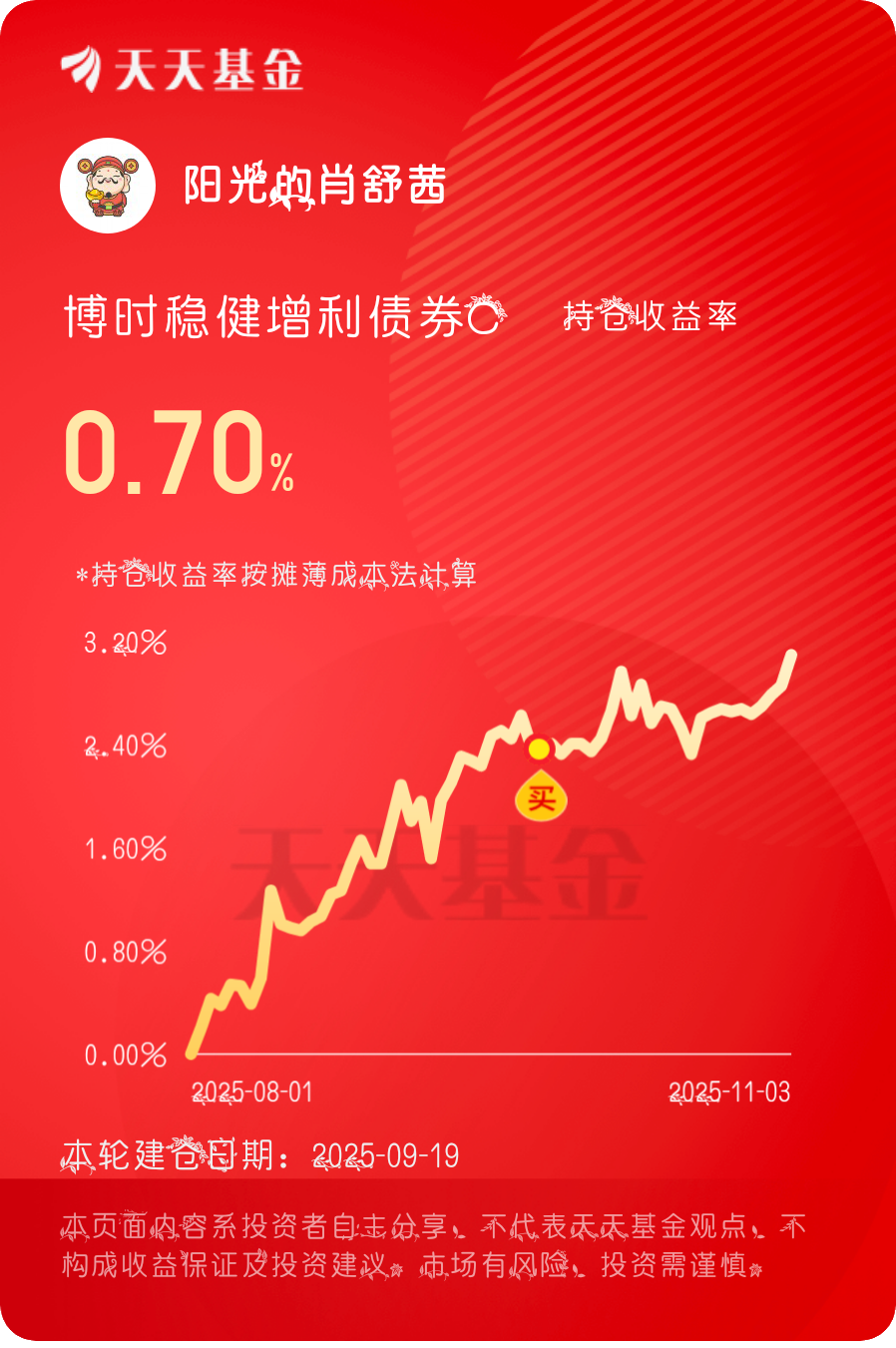 昨天$博时稳健增利债券C$ 净值又往上冲了一截,涨了0.23%,半年收益率稳稳站上6.67%,其持续赚钱能力很不错。最近央行不仅恢复买债,还提到要探索向非银机构提供流动性的机制,这相当于给债市加了 双保险,既能通过买债直接稳定市场预期,又能减少关键时点的资金波动,对这只基金持有的信用债和同业存单来说太重要了,现在看央行的呵护态度明确,债券收益率顶部已经显现,接下来就是持续修复行情,基金的债券仓位正好能坐享收益。再看它的权益部分,配置更显功力,重仓中国太保,保险板块最近受益于长端利率企稳和负债端改善,估值处于历史低位,安全边际十足。还有海信视像,消费电子板块随着新品发布周期回暖,刚好蹭上消费复苏的热点。这些个股要么是低估值防御品种,要么是高景气成长标的,搭配得特别合理。只用不到20%的仓位就能在震荡市里贡献收益,既不影响基金整体的稳健性,又能抓住市场机会。现在大盘横盘,很多人都在纠结要不要进场,我看好博时稳健增利。债券部分有央行政策托底,权益部分踩中消费和金融热点,抗跌跟涨,省心又稳赚!#科技热点摊开业啦# #晒收益#