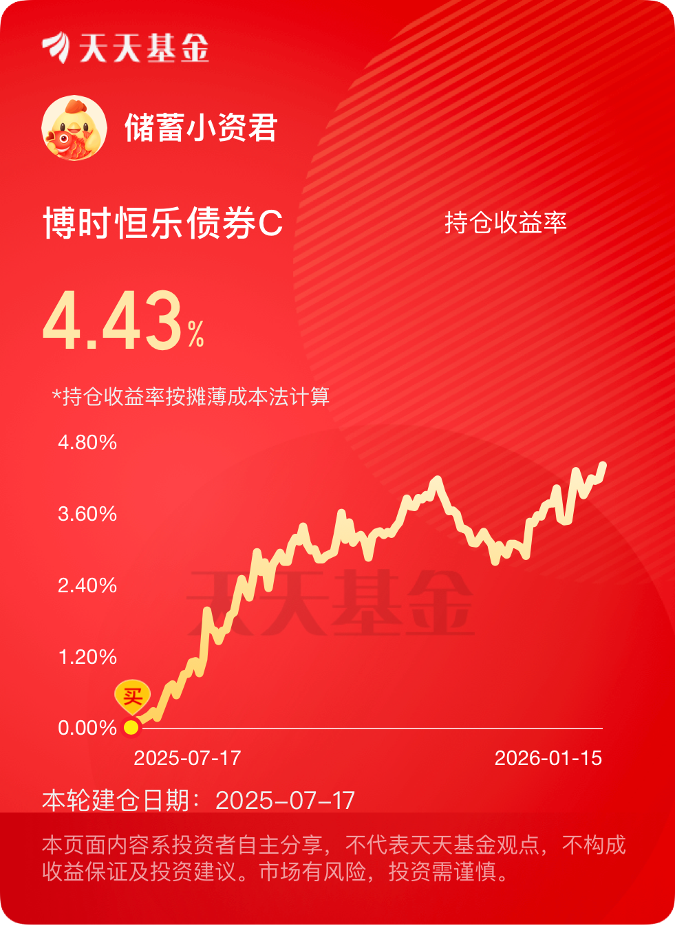 最近债市行情向好,$博时恒乐债券C$ 债券为主,股票为辅,昨天权益仓行情抓得好,这基两头受益,稳稳拿下23个鸵鸟蛋。近一个攒了135个蛋,六个月时间到账438个,这持续赚钱能力很强。最近央行宣布再贷款、再贴现利率下调!1月15日央行明确自1月19日起,下调再贷款、再贴现利率0.25个百分点,下调后1年期支农支小再贷款利率降到1.25%,再贴现利率1.5%。这个政策直接降低了银行的资金成本,稳定净息差的同时,也给债市流动性环境添了把火。这基的债券仓位以高等级信用债和利率债为主,还会通过息差策略放大收益,资金成本下降后,债券市场的整体收益空间被打开,这基自然能精准受益。而且它权益仓位的热点踩中率,简直像开了上帝视角!配置了消费电子板块个股,近期消费电子迎来换机潮叠加技术升级,相关个股走势强劲,直接给基金收益加了buff。另外还布局了港股通里的优质标的,利用两地市场估值差异套利,最近港股市场情绪回暖,这部分仓位也贡献了不少收益。这基权益策略是沪港深三地精选个股,再搭配ETF布局,既分散了风险,又能精准捕捉不同市场的热点,灵活又稳盈!#存储芯片需求火爆 巨头新产能提前投产#