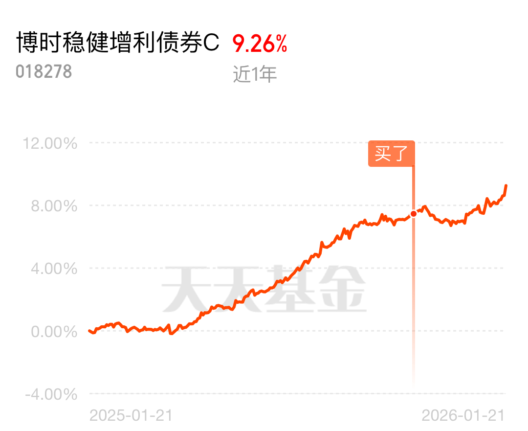 债市暖风持续吹,$博时稳健增利债券C$ 这波节奏踩得准!权益部分跟上了市场热点,净值连着五天上涨,昨天尤其给力,拿下58个鸵鸟蛋。半年时间累计收蛋547个,长期看业绩也挺能打的。最近债券供给节奏优化加上配置型资金持续入场利好债市,1月份第一周债券集中发行后,第二周供给节奏明显放缓,短期供给冲击大大减轻,债市企稳修复的环境越来越好。而且国盛证券等机构都分析过,现在债券相对性价比在提升,配置性机构一直在持续买入,推动债市企稳的力量越来越强。博时这基的债券底仓正好受益于这波行情,高等级信用债和利率债的配置比例很合理,既能拿到稳定的票息收益,又能享受债券价格回升带来的资本利得。而且它的权益仓很会踩点,前十大重仓股里的人福医药今天表现超亮眼,近期公司基本面持续改善,加上医药板块估值修复,单日涨幅达到2.3%,直接为基金贡献了不少收益。还有盛达资源,作为贵金属相关企业,近期受益于全球通胀预期温和回升,也有不错的表现,股价稳步上涨。开年以来,市场风险偏好提升,但板块轮动很快,很多基金都踩不准节奏,而这基的权益仓却能精准捕捉到医药、贵金属这些热点板块的机会,且持仓分散,风险控制得很好,稳盈又省心。#电网5万亿投资创纪录!产业链企业受益#