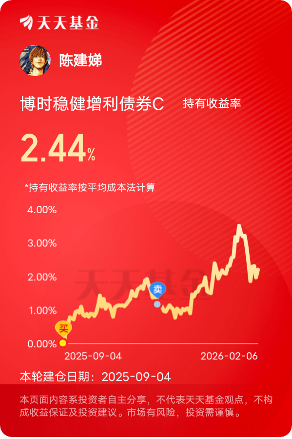 市场给力,$博时稳健增利债券C$ 立马给惊喜!这波债市不错,股市也有看点,这基机会抓得准,稳稳拿下20多个蛋,近一年超8%的收益,业绩过硬。2026年以来债市回暖趋势明显,央行持续呵护流动性,跨节资金无忧。2月10日,财政部、央行还会开展1500亿元1个月期国库现金定存招标,进一步补充银行间流动性,这意味着市场上的资金会越来越充裕,短端利率会维持低位,而这只基金的债券部分主要配置中短久期债券,刚好能最大化享受这份利好,稳步赚取利息收益,不用承受长端利率波动的风险。加上化债专项债加速发行,而且是靠前发力,这会让城投债、地方债的估值修复,而这基的相关债券既能享受化债带来的收益,又能规避信用风险,简直是双赢。而且它的权益仓布局了铜陵有色、藏格矿业、盐湖股份这几只有色股,踩中了最近有色板块的回暖行情,最近全球大宗商品价格回暖,有色板块整体景气度提升,铜陵有色作为铜行业龙头,藏格矿业、盐湖股份作为锂资源龙头,后续上涨空间很大。而且这几只股票在基金净值中的占比不算高,既能贡献超额收益,又不会增加太多风险,这配置相当聪明,既不影响基金的稳健性,又能抓住热点赚差价。#暖阳创作计划# #晒收益#