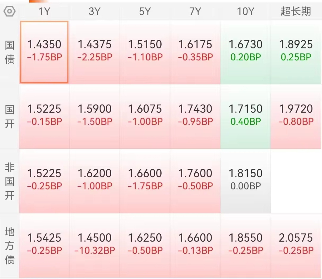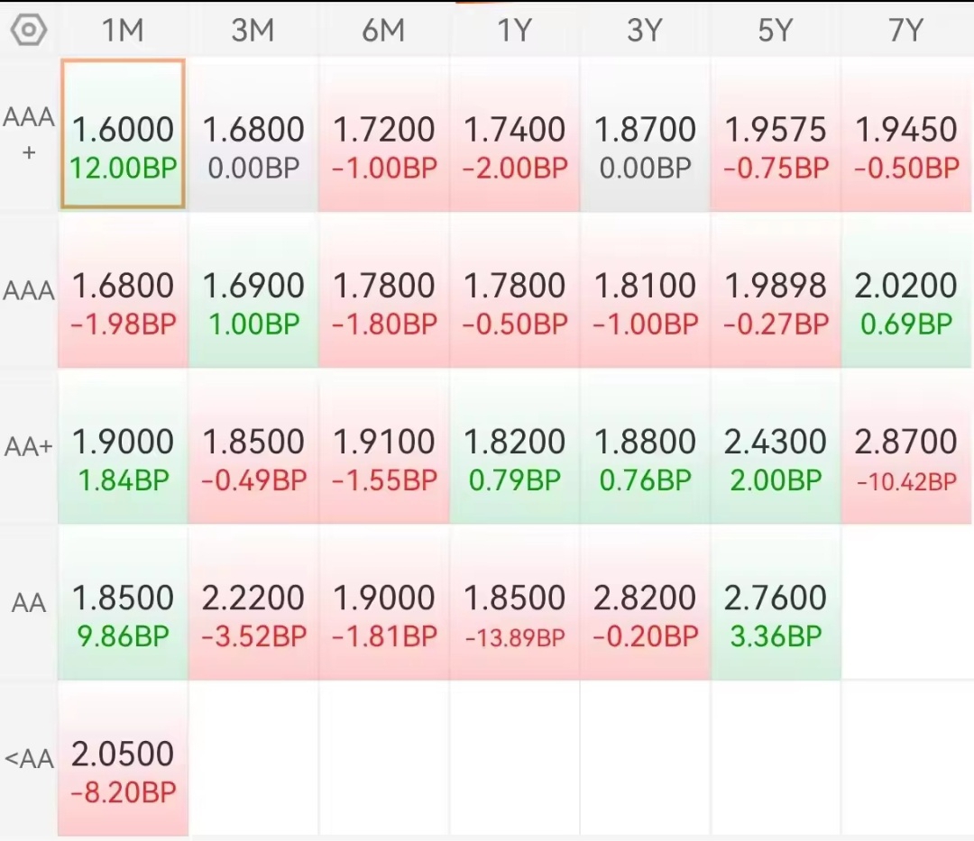 市场午盘:利率债这边还是可以小幅收蛋,信用债盘面总体也都是红多绿少,小晴天儿!涨幅一般般,但是城投债这边绿盘的也不少啊,近期怎么又到城投债一般般了,希望长债都可以