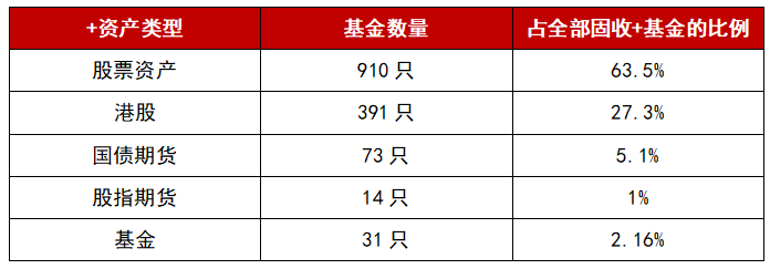 随着国内利率绝对水平的不断下降,国内基金产品投资创新也在不断拓展,“固收+”基金在各类资产上的尝试百花齐放,丰富了“固收+”的收益来源。在“+”的部分,除传统的股票、可转债外,港股、国债期货、股指期货、商品等资产也陆续被纳入“固收+”基金的投资范围。与此同时,以“基金”作为“+”部分的“固收+”产品也逐渐增多。